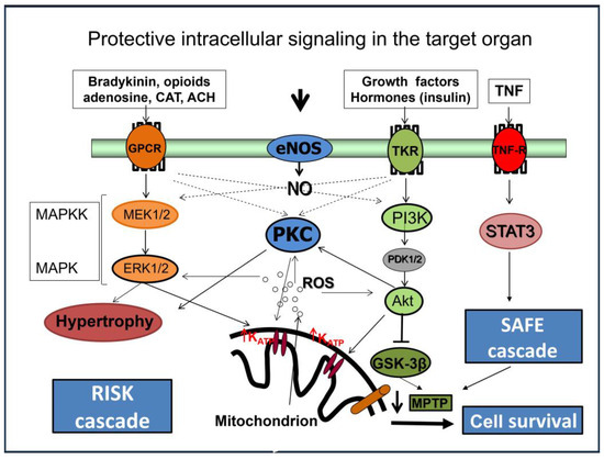 It is, therefore, assumed that triggering several forms of cardioprotection (RPC, exercise PC) involves similar neuronal signaling (parasympathetic and sympathetic activation) [97]. The signal can be further transmitted through the complex neuronal and humoral pathways [80] and through systemic response (suppression of inflammation, oxidative stress, and changes in the gene expression) [84]. In accord, in mice subjected to RPC 24 h prior to myocardial I/R, anti-inflammatory cytokine interleukin-10 (IL-10) has been found to be upregulated [7] (Figure 2). It is suggested that the humoral pathway is associated with the activation of cell survival cascades RISK (reperfusion injury salvage kinase)–PI3K/Akt-GSK3ß-mPTP and SAFE (survival activating factor enhancement)–TNF-α-IL-10-STAT3-mitoKATP (mitochondrial ATP-dependent K+ channels) [41,98] (Figure 3). It is expected that these pathways can also be activated by exercise stimuli.