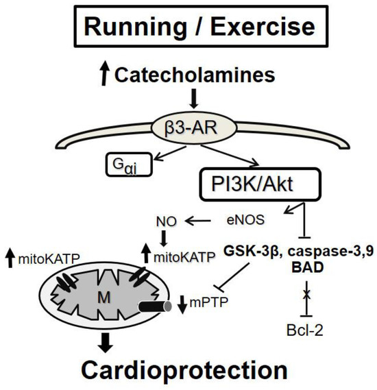 - Calvert, J.W.; Condit, M.E.; Aragón, J.P.; Nicholson, C.K.; Moody, B.F.; Hood, R.L.; Sindler, A.L.; Gundewar, S.; Seals, D.R.; Barouch, L.A.; et al. Exercise Protects against Myocardial Ischemia-Reperfusion Injury via Stimulation of β(3)-Adrenergic Receptors and Increased Nitric Oxide Signaling: Role of Nitrite and Nitrosothiols. Circ. Res. 2011, 108, 1448–1458. [Google Scholar] [CrossRef]