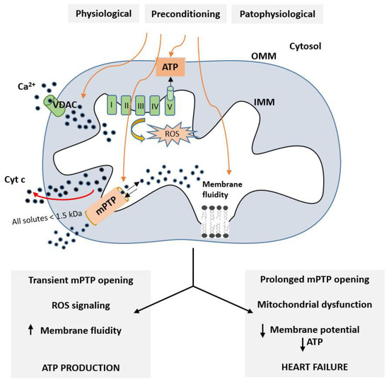 Over the recent years, the view on mitochondria in the heart as a cellular powerhouse providing adenosine triphosphate (ATP) supply needed to sustain contractile function, basal metabolic processes, and ionic homeostasis has changed radically. At present, it is known that dysfunctions of these organelles are essential in the development of many diseases, including cardiovascular diseases [86,129,130,131]. Moreover, mitochondria are a very promising target of endogenous strategies that are essential in protecting the myocardium from acute I/R injury. These strategies, including IPC, RPC, and other noninvasive adaptive approaches, provide a similar effect of protection [132]. Preservation of mitochondrial membrane function and respiratory properties has been shown to be an important mechanism of cardioprotection [132,133]. Mitochondria are involved in attenuation of processes, leading to cell death because end-effector systems (mitoKATP, mPTP) become localized in mitochondria [55,95,96]. Regulation of mPTP seems to be an important part of the mechanisms that maintain the energy equilibrium of the heart under pathological conditions. There are two ways in which the mPTP opens (Figure 5). Pathological processes, as well as I/R injury, induce prolonged mPTP opening [134,135]. Prolonged mPTP opening increases the permeability of the inner mitochondrial membrane (IMM) and allows the entry of metabolites into the mitochondrial matrix, which in turn leads to the decrease in membrane potential of the mitochondrial membrane, the disconnection of the respiratory chain, the cessation of ATP synthesis in the mitochondria, and eventually mitochondrial swelling, leading to the rupture of the outer mitochondrial membrane (OMM), which releases cytochrome c (Cyt c) and causes cell death [136,137,138]. PC induces a cardioprotective effect through inhibiting the opening of mPTP [139,140]. Transient opening of the mPTP belongs to the physiological processes that mitochondria use in the healthy functioning of the cell [141] associated with a transient increase in ROS as signaling molecules and increased membrane fluidity [132,142]. It is thought that the transient opening of the mPTP may regulate Ca2+ in the cytosol when Ca2+ overload occurs. Opening of mitoKATP induces a moderate increase in ROS production, which activates protective signaling, preventing reperfusion-induced mPTP opening and loss of mitochondrial membrane integrity. That is followed by disruption of the integrity of the mitochondrial membrane and the release of proapoptotic molecules (e.g., Cyt c), activating mechanisms of cell death [132,143]. Thus, simulating the effect of RPC through pharmacological modulators of mPTP opening using drug cyclosporin A [144] appears to be a promising approach; this has already been applied in patients with AMI prior to angioplastic intervention [145,146]. It can be mentioned that such modulation of mPTP opening has also been suggested to underlie, in part, the cardioprotection of necrostatin-1, a drug that inhibits necroptosis, because its infarct size-reducing effects failed in cyclophilin-D-deficient mice (cyclophilin-D is a key component of mPTP) [147]. Although many questions are unresolved in this regard, including the precise role of mitochondria in necroptosis execution, these findings, as well as the data about the anti-necroptotic action of IPC [148], support the theory of cardioprotection by limiting this cell death due to mitochondria modulation.