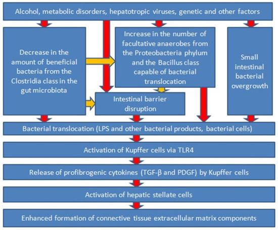 Maslennikov, R.; Poluektova, E.; Zolnikova, O.; Sedova, A.; Kurbatova, A.; Shulpekova, Y.; Dzhakhaya, N.; Kardasheva, S.; Nadinskaia, M.; Bueverova, E.; et al. Gut Microbiota and Bacterial Translocation in the Pathogenesis of Liver Fibrosis. Int. J. Mol. Sci. 2023, 24, 16502. https://doi.org/10.3390/ijms242216502