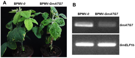 To understand the roles of autophagy in soybeans, a virus-induced gene silencing approach, mediated by the Bean pod mottle virus (BPMV), was used to silence multiple Autophagy-related genes (ATGs), one of which was the ATG7 homologue. The soybean is a paleotetraploid plant; 75% of the genes in its genome have two copies [32]. However, only one ATG7 homologue was identified in the soybean genome; therefore, it was referred to as GmATG7. A 330-bp fragment of GmATG7 was cloned into BPMV2 [33,34] and formed the BPMV2-GmATG7 silencing construct. GmATG7 silencing was achieved via co-bombardment of BPMV1 and BPMV2-GmATG7 plasmids coated on gold particles onto two expanded true leaves of 7-day-old soybean seedlings. Meanwhile, BPMV1 and BPMV2 were co-bombarded onto different seedlings and used as empty vector controls (referred to as BPMV-0). At 15–20 days post bombardment (dpb), BPMV symptoms were visible on the upper systemic leaves, indicating successful infection. Systemic leaves with BPMV symptoms were collected and ground into powders with a pestle and mortar and then resuspended into a phosphate buffer (pH, 7.0). After centrifugation, the saps were collected and rub inoculated onto two true leaves of a batch of 7-day-old seedlings. At 15 days post inoculation (dpi), RNA samples were extracted from these plants for the verification of silencing by RT-PCR. After verification, these plants could be used for subsequent experiments. No obvious differences were observed between the GmATG7-silenced plants and the empty vector control plants (Figure 1A), indicating that silencing GmATG7 did not affect growth and development in soybeans. A RT-PCR analysis showed that the GmATG7 was indeed silenced, as its transcript level was significantly reduced in the GmATG7-silenced plants relative to the vector control plants (Figure 1B).