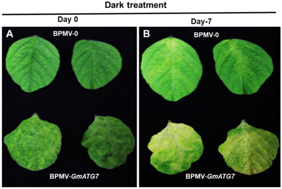 Under natural conditions, various Arabidopsis atg mutants exhibit an accelerated senescence phenotype [30,35,36,37,38,39]. To examine whether the GmATG7-silenced soybean plants shared a similar phenotype, the leaves from BPMV-0 and GmATG7-silenced plants were collected and dark treated in a Petri dish wrapped with aluminum foil. Long-term dark treatment results in carbon deficiency because of the lack of photosynthesis, which induces autophagy and accelerates senescence. As anticipated, GmATG7-silenced leaves displayed a chlorosis phenotype that was not observed in BPMV-0 leaves after the dark treatment for 7 days (Figure 2). This result demonstrated that silencing GmATG7 leads to autophagy impairment.