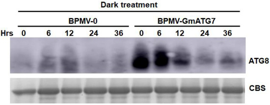 Silencing GmATG7 resulted in an elevated accumulation level of GmATG8. A comparison of GmATG8 protein accumulation level between BPMV-0 control plants and the BPMV-GmATG7-silenced plants treated in the dark for different periods of time.