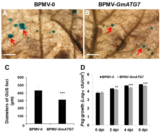 Silencing GmATG7 leads to the reduced resistance of soybeans to SMV-N-GUS. (A,B). A comparison of the GUS foci on the leaves of the BPMV-0 (left) and the BPMV-GmATG7 plants (right) under microscopy; arrows point to the GUS foci; bar = 5 mm; (C) A comparison of the diameters of the SMV-N-GUS foci on the leaves of BPMV-0 and BPMV-GmATG7 plants; error bars indicate that standard deviation was calculated by measuring at least 20 lesions (≥60 lesions) in three independent leaves; (D) A growth assay for Psg infection. Cfu = colony forming unit. ** represents p < 0.01 and *** represents p < 0.001, Student’s t-test.