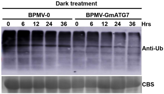 Proteins were extracted from dark-treated BPMV-0 and BPMV-GmATG7 leaves. Western blotting was performed using Anti-Ubq (Agrisera, AS08307, Vännäs, Sweden) or anti-ATG8 (Agrisera, AS142769), as previously described [51].