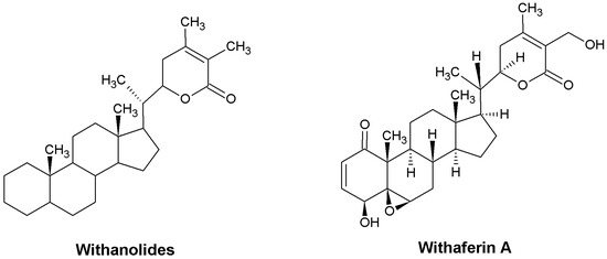 - Sultana, T.; Okla, M.K.; Ahmed, M.; Akhtar, N.; Al-Hashimi, A.; Abdelgawad, H.; Haq, I.-U. Withaferin A: From Ancient Remedy to Potential Drug Candidate. Molecules 2021, 26, 7696. [Google Scholar] [CrossRef]