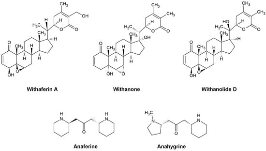 - Singh, N.; Yadav, S.S.; Rao, A.S.; Nandal, A.; Kumar, S.; Ganaie, S.A.; Narasihman, B. Review on anticancerous therapeutic potential of Withania somnifera (L.) Dunal. J. Ethnopharmacol. 2021, 270, 113704. [Google Scholar] [CrossRef]
