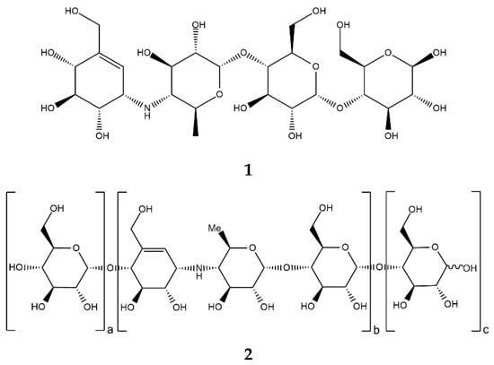 Acarbose (Figure 2, 1), a clinically important drug that is used for the treatment of T2D, was originally found as a component of a complex mixture of pseudo-oligosaccharide-type secondary metabolites from actinomycete Actinoplanes strain SE 50/110. Structurally, acarbose contains a C7N aminocyclitol moiety (valienamine) linked via the nitrogen atom to 6-deoxyglucose (this dimer is also called acarviosin), which, in turn, is linked to a maltose moiety via an α-(1→4)-bond [29].