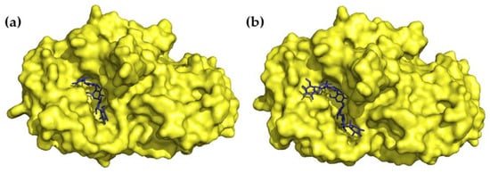 The family of lectin-like inhibitors is abundant in Phaseolus sp. [103]. The best studied isoform, α-AI1 (22.5 kDa), was purified from common bean Phaseolus vulgaris and was characterized at the molecular level as an α-amylase inhibitor of a novel class homologous to phytohemagglutinin [104]. α-AI1 potently inhibited PPA (Ki 3 × 10−11 M) [105,106] as well as insect α-amylases [100]. Another inhibitor, α-AI2, was isolated from wild accessions of the common bean. Although it shares 78% sequence similarity with α-AI1, it shows no activity towards mammalian α-amylases [107]. These inhibitors have a heterotetramer structure consisting of two pairs of noncovalently bound glycopeptide subunits α and β. α-AI1 and α-AI2 acquire their active form through a series of post-translational modifications. The polypeptide precursor is processed into two chains, which is followed by clipping the C-terminal Asn of the α-chain and seven C-terminal residues of the β-chain. The mature proteins also undergo glycosylation with different patterns for α-AI1 and α-AI2 [108]. The X-ray structures of α-AI1 in complex with PPA and HPA have been determined (Figure 6b). It was shown that the interaction occurs through the blockade of the enzyme’s catalytic residues with the inhibitor’s two hairpin loops extending out from the jellyroll fold. α-AI1 shows substrate mimicry, which allows it to effectively fill the substrate-docking region of the α-amylase. The inhibition of PPA and HPA is very similar, though it was revealed that α-AI1 forms additional hydrogen bonds with the B-domain of HPA in the region where amino acid sequences of the two enzymes differ [109,110]. Homology modeling and docking simulation predicted the structural determinants responsible for the different specificity of α-AI1 and α-AI2. The modeled α-AI2 did not meet the steric obstacles to penetrating the PPA cleft, but was unable to form enough hydrogen bonds for a stable complex due to amino acid sequence divergence from α-AI1 in the loop regions [111].