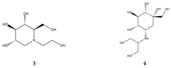 α-Glucosidase inhibitors (AGI), specifically, α-amylase inhibitors, are a distinct class of anti-diabetic drugs, but only three compounds (acarbose, miglitol (Figure 4, 3), and voglibose (Figure 4, 4)) are used in clinics and are commercially available. Acarbose originated as a natural product from the secondary metabolome of Actinoplanes, miglitol is a semisynthetic 1-deoxynojirimycin derivative, and voglibose is produced through the chemical modification of antibiotic validamycin C. Acarbose acts on α-amylase and other α-glucosidases, while voglibose and miglitol are effective against small intestine villi α-glucosidases but are inactive against starch-degrading α-amylase [37,38].