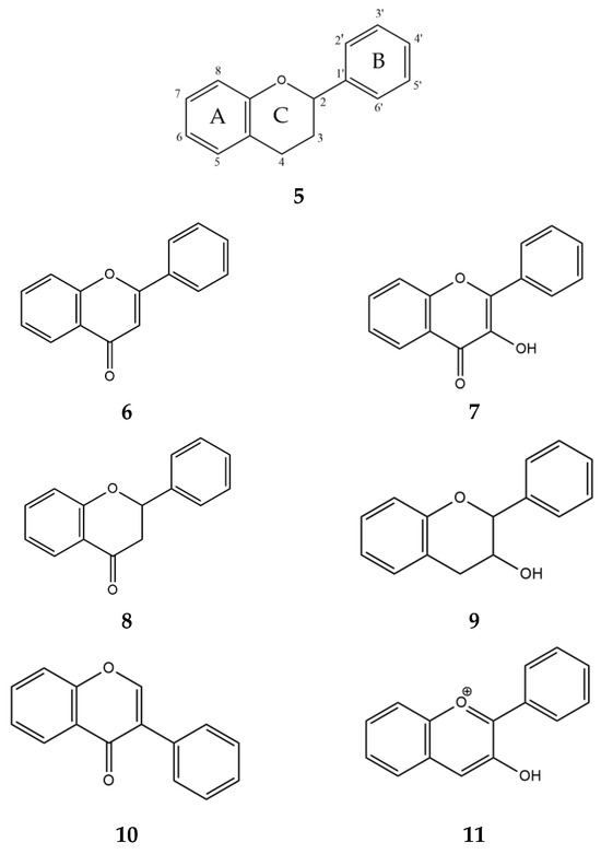 Generalized chemical formulas of flavonoids (5) and six subclasses of flavonoids: flavones (6), flavonols (7), flavanones (8), flavan-3-ols (9), isoflavones (10), and anthocyanidins (11).