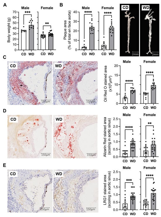 LRG1 in calcified atherosclerotic plaques in a mouse model of advanced atherosclerosis. (A) Body weights in male (n = 9–11/group) and female (n = 18/group) ApoE−/− mice after 27 weeks of Western diet (WD) or normal chow diet (CD). (B) Quantification of the plaque area and representative images of en face aortas for CD and WD-fed male and female mice (n = 9–11/group). (C–E) Representative histological images and quantitative analysis in serial sections of aortic sinus from CD and WD-fed male and female mice showing plaque lipid content with Oil Red O coloration (n = 9–11/group) ((C) red staining), plaque calcification with the Alizarin Red staining (n = 16–18/group) ((D) dark red staining) and LRG1 expression (n = 16–18/group) ((E) brown staining). Scoring for Alizarin Red and LRG1 was performed with 3 scores: 0 (no staining), 1 (weak staining), and 2 (strong localized staining). ** p < 0.01, *** p < 0.001, **** p < 0.0001 via Mann–Whitney U test for (A,C,D) and Student’s t-test for (B,E). Normally distributed data are presented as mean ± SEM, and non-normally distributed data are presented as median with lower and upper quartiles.