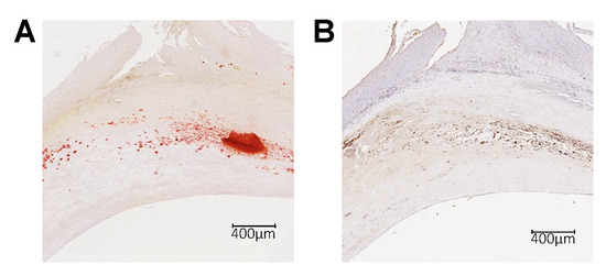 LRG1 in calcified atherosclerotic plaques in humans. Histological images of human carotid plaque serial sections showing (A) plaque calcification with the Alizarin Red staining (dark red staining) and (B) LRG1 expression (brown staining).