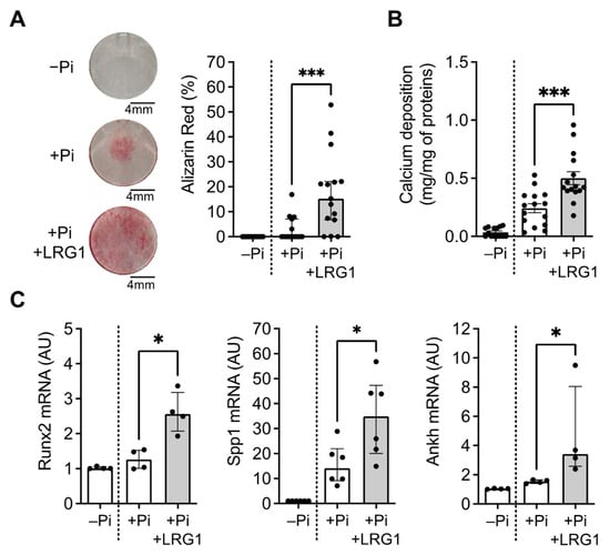 Effect of LRG1 in VSMC trans-differentiation and calcification. (A,B) Representative images and quantification of Alizarin Red staining (A) and quantification of calcium deposition (B) in MOVAS treated with control (−Pi) or calcification medium (+Pi) with or without 20 μg/mL LRG1 (+LRG1) for 6 days (n = 15 replicates/group from 5 independent experiments). (C) Quantification of osteoblast-like cells phenotype markers relative mRNA expression Runx2, Spp1, and Ankh in MOVAS treated with control (−Pi) or calcification medium (+Pi) with or without 20 μg/mL LRG1 (+LRG1) for 6 days (n = 4 independent experiments/group). * p < 0.05, *** p < 0.001 by Mann–Whitney U test for (A,C) and Student’s t-test for (B). Normally distributed data are presented as mean ± SEM and non-normally distributed data are presented as median with lower and upper quartiles.