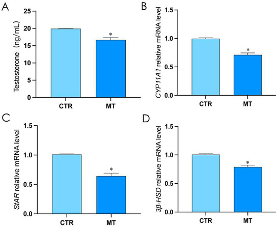 In order to verify the effect of melatonin on rooster Leydig cells, the rooster Leydig cells were divided into the control group (CTR) and the melatonin treatment group (MT). Compared with CTR, the testosterone level, and the mRNA level of StAR, CYP11A1, and 3β-HSD in MT significantly decreased (p < 0.05, Figure 1A–D).