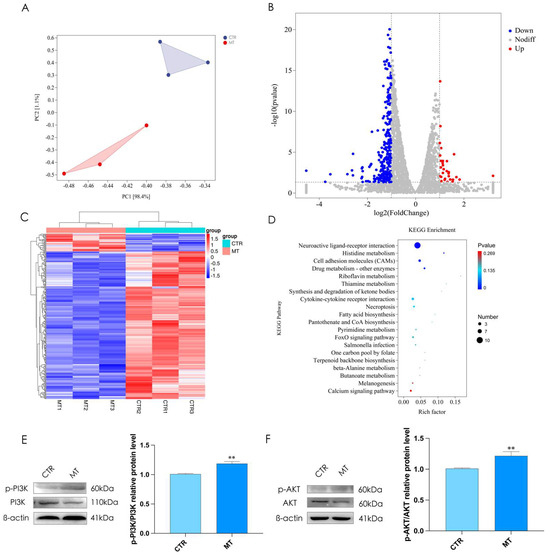 Differentially expressed mRNA under melatonin treatment in rooster Leydig cells. (A) Principal component analysis for CTR and MT. (B) Differentially expressed mRNA between the CTR group and the MT group. (C) Cluster analysis of all mRNAs between CTR and MT. (D) KEGG analysis between CTR and MT. (E,F) The phosphorylation level of PI3K and AKT between CTR and MT. All data are presented as the mean ± SD (n = 3), ** p < 0.01.