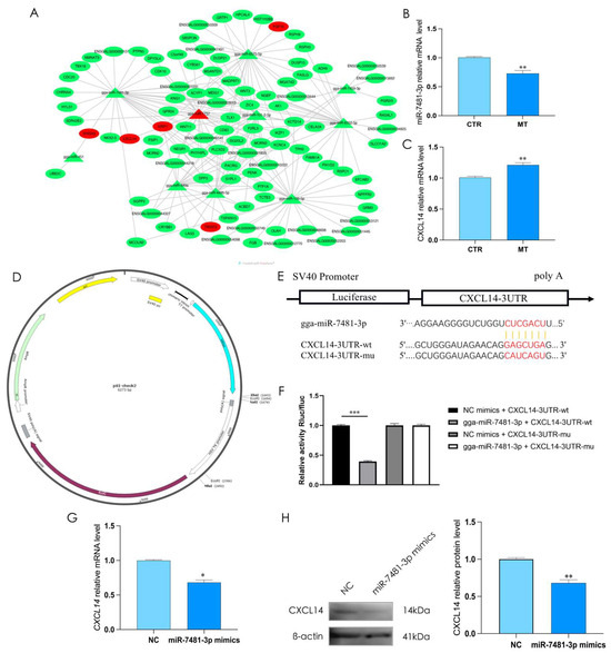 CXCL14 is the direct target of miR-7481-3p. (A) Predicted potential targets of miR-7481-3p. (B,C) The relative mRNA expression of miR-7481-3p and CXCL14 in rooster Leydig cells. (D) Predicted miR-7481-3p binding sites in the CXCL14 3′-UTR. (E) The luciferase reporter vector fused with CXCL14 3′-UTR WT or its MUT was constructed. (F) Dual luciferase assay on luciferase activity in different treatment groups. (G,H) Over-expressed miR-7481-3p to detect the relative mRNA and protein expression of CXCL14 in rooster Leydig cells. All data are presented as the mean ± SD (n = 3), * p < 0.05, ** p < 0.01 and *** p < 0.001.