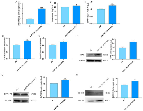 To better understand the functions of miR-7481-3p in the process of testosterone synthesis in rooster Leydig cells, we transfected rooster Leydig cells with miR-7481-3p mimics for 48 h (p < 0.05, Figure 5A), which was found to significantly increase the expression of StAR, CYP11A1, and 3β-HSD and the level of testosterone (p < 0.05, Figure 5B,C). These results indicated that miR-7481-3p could promote testosterone synthesis in rooster Leydig cells.