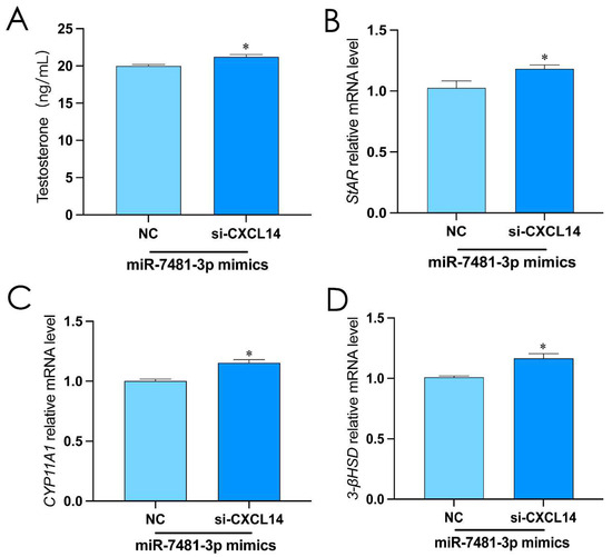 In order to assess whether CXCL14 mediates the effects of miR-7481-3p in rooster Leydig cells, we transfected miR-7481-3p mimics and interfered CXCL14 for 48 h. The results showed that the level of testosterone increased significantly in rooster Leydig cells (p < 0.05, Figure 6A–D). These results indicated that CXCL14 is the direct target of miR-7481-3p in rooster Leydig cells.