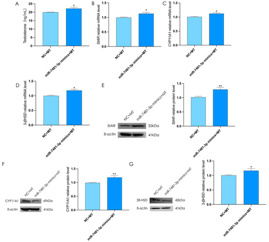 To prove whether miR-7481-3p was involved in melatonin inhibiting testosterone synthesis in rooster Leydig cells, we overexpressed miR-7481-3p for 12 h and then treated with melatonin for 36 h. The results showed that the overexpression of miR-7481-3p could also reverse the inhibitory effects of melatonin on testosterone levels and the expression of StAR, 3β-HSD, and CYP11A1 in rooster Leydig cells (p < 0.05, Figure 7A–G). These results indicated that the inhibitory effect of melatonin on testosterone was achieved by down-regulating the expression of miR-7481-3p.