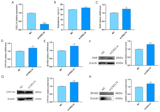 To determine the effect of CXCL14 on testosterone synthesis in rooster Leydig cells, we interfered CXCL14 for 12 h to reduce its expression in Leydig cells (p < 0.05, Figure 8A). The results showed that interfering CXCL14 could significantly promote testosterone levels in rooster Leydig cells, and significantly up-regulate the expression of StAR, CYP11A1, and 3β-HSD (p < 0.05, Figure 8B). These results suggested that CXCL14 could inhibit testosterone synthesis in rooster Leydig cells.