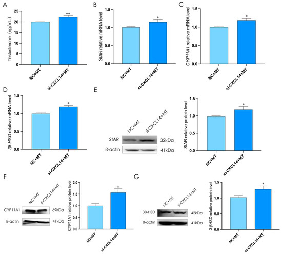 To clarify the function of CXCL14, we interfered CXCL14 for 12 h and treated rooster Leydig cells with melatonin for 36 h (p < 0.05, Figure 9A). The results showed that compared with the NC + MT groups, the expression of StAR, CYP11A1, and 3β-HSD and testosterone levels in si-CXCL14 + MT groups were significantly increased (p < 0.05, Figure 9B–G). These results demonstrated that melatonin could inhibit testosterone synthesis through CXCL14 in rooster Leydig cells.