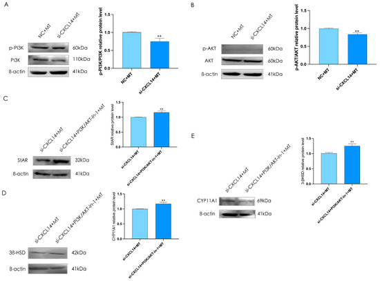 Previous results show that melatonin can inhibit testosterone synthesis through miR-7481-3p/CXCL14 in rooster Leydig cells, but it is not clear whether PI3K/AKT is involved. To determine whether the PI3K/AKT signaling pathway is involved in melatonin-induced testosterone synthesis, we treated rooster Leydig cells with or without 20 μM PI3K/AKT-IN-1, which is the inhibitor for PI3K/AKT, for 30 min, and then interfered CXCL14 for 48 h, and found that interfering the expression of CXCL14 and treating cells with melatonin could significantly inhibit the expression of p-PI3K and p-AKT (p < 0.05, Figure 10A,B).The results indicated that PI3K/AKT-IN-1 could reverse the inhibitory effect of CXCL14 on the expression of StAR, CYP11A1, and 3β-HSD (p < 0.05, Figure 10C–E).