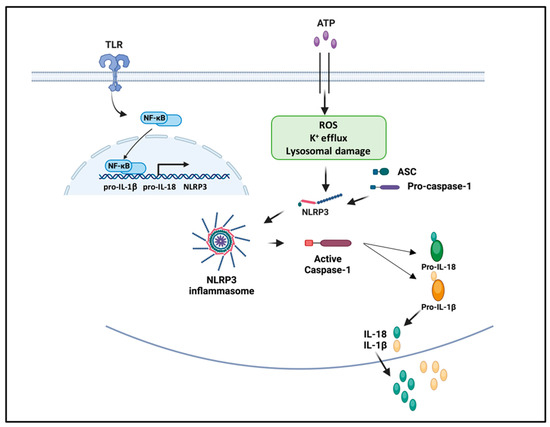 The efflux of potassium is a requirement for the formation of the NRLP3 inflammasome, and it can be stimulated by toxins or ATP molecules that active the potassium channels causing potassium to leave the cells. Moreover, many microbial stimuli can also trigger the assembly of the inflammasome, including molecules from gram-positive and gram-negative bacteria, viruses, and fungi [20].