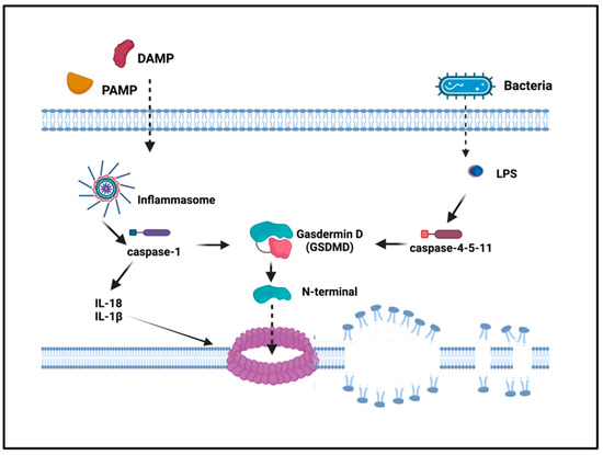 Unlike apoptosis, pyroptosis is a more recently identified form of necrotic and inflammatory programmed cell death induced by inflammatory caspases that occurs most frequently upon microbial infection (intracellular pathogens) and danger signals. In fact, pyroptosis has been defined as a critical mechanism by which inflammasomes contribute to host responses against viruses and gram-negative bacterial pathogens, preventing intracellular replication of infectious agents via the elimination of the infected macrophages and dendritic cells altogether [21,22]. Initially proposed to ascribe the inflammatory nature to caspase-1-dependent cell death, the term of pyroptosis has now been broadened to include cell death driven by non-canonical inflammatory caspases, (caspases 1, 4, 5 in humans and 11 in mice). Recent studies have demonstrated that gasdermin D (GSDMD) mediates pyroptosis following the activation of the inflammasome [23,24]. GSDMD contains an N-terminal cell death domain (GSDMD-NT), a central short linker region, and a C-terminal autoinhibition domain. Activated caspases cleave GSDMD, generating an N-terminal cleavage product (GSDMD-NT) that oligomerizes and inserts into the plasma membrane forming a pore, thus triggering pyroptosis, the inflammatory type of cell death [25] (Figure 3).