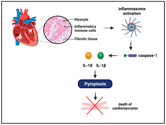 Inflammasome activation leads to pyroptosis, the highly regulated inflammatory cell death described above, which represents a harmful stimulus for enhancing inflammation [35]. IL-1β is the prototypical proinflammatory cytokine within the inflammasome that induces cell death in cardiomyocytes (Figure 4). As consequence, strategies aimed to inhibit IL-1 reduce pyroptosis of cardiomyocytes provoked by ischemia, limiting the worsening progression towards cardiac dysfunction [36]. While myocardial injury is always associated with inflammation, the strength of this response vary according to individual features and may be assessed as marker of a negative prognosis [37].