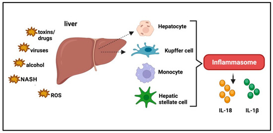 Inflammasomes and liver disease. Inflammasomes are triggered by hepatotropic infective agents but are also involved in the pathogenesis of acute liver injury induced by toxins, drugs, or ischemia/reperfusion, or in chronic liver diseases including alcoholic and non-alcoholic steatohepatitis (NASH).