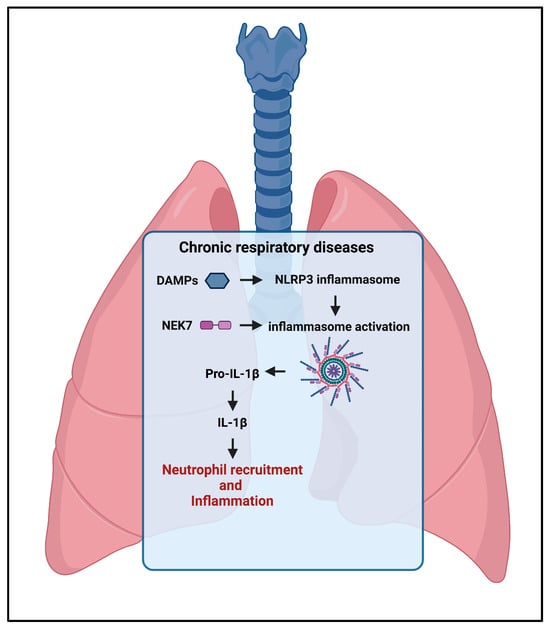 The inflammasome plays a crucial role in the pathogenesis of acute and chronic respiratory diseases [77]. As in other organ-specific disorders, the NLRP3 inflammasome is first activated by microbial agents, then followed by a second signal that can be triggered by a wide range of factors acting as DAMPs such as extracellular ATP, toxins, RNA viruses, ion flow, mitochondrial dysfunction, ROS, or lysosomal damage, all occurring during pulmonary inflammation.