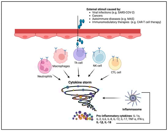 The activation of the inflammasome has also been involved in the pathogenesis of life-threatening systemic inflammatory syndromes grouped under the umbrella name of cytokine storm [92]. Although there are no accepted definitions that can capture the entirety of these syndromes, clinical disorders called cytokine storm or cytokine release syndrome are characterized by elevated levels of circulating cytokines, immune hyperactivation, and multi-organ disfunction that can come to be fatal [93]. Blockades of pro-inflammatory cytokines, first IL-6, then interferon-γ and IL-1, have been shown to be therapeutic in many cytokine storms [94,95,96,97,98,99]. A cytokine storm can develop during very different pathological conditions, from viral infections to cancers and autoimmune diseases, and upon immunomodulatory therapies [93]. Although they have different pathogeneses, they share systemic multi-organ damage that is caused by a dysregulated, excessive host immune response rather than by the associated microbial pathogen or endogenous insult [100] (Figure 7).