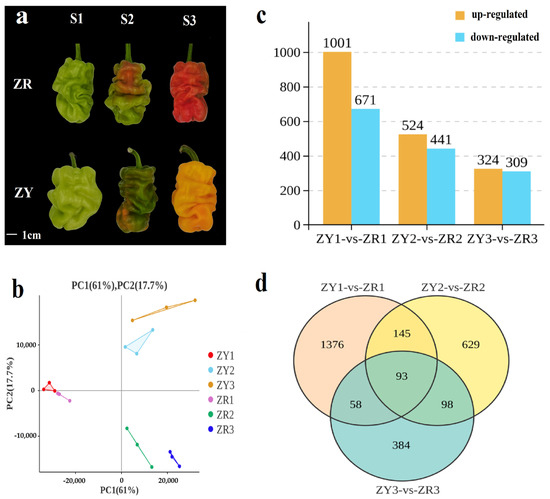 Fruit colors and number of DEGs between two pepper varieties. (a) Changes in the color of pepper fruits from the two cultivars in the three developmental stages; (b) PCA score plot; (c) The number of upregulated and downregulated DEGs in the pepper at three developmental stages; (d) Venn diagram of DEGs in different comparison groups.