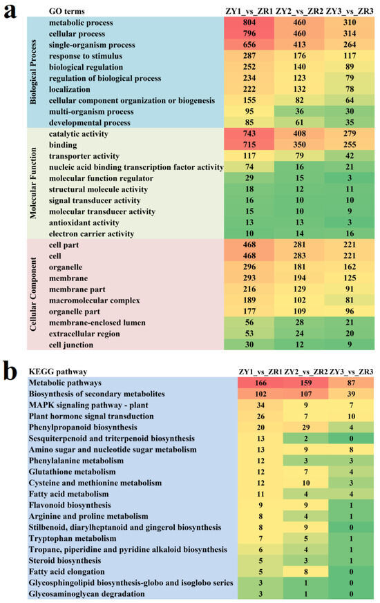 Functional annotation of the DEGs in the three stages between ZY and ZR was performed based on the KEGG database to further investigate the functions of DEGs that might be related to the formation of pepper fruit color. The results revealed that 108 (Table S8), 98 (Table S9) and 82 (Table S10) pathways were annotated in stages S1, S2 and S3, respectively (Figure 2b).