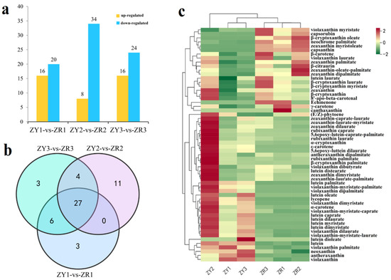 Variations in the carotenoid contents in the pepper fruit of ZY and ZR at three developmental stages. (a) The number of upregulated and downregulated DAMs in the pepper at three developmental stages; (b) Venn diagram of DAMs in different comparison groups; (c) heatmap of carotenoid contents in the pepper fruit of ZY and ZR at three developmental stages.