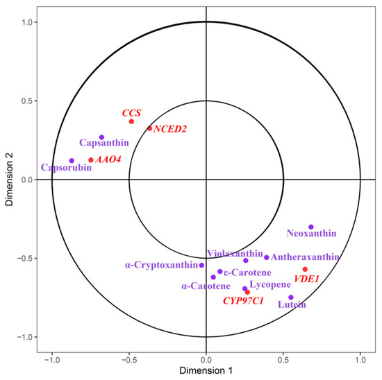 Metabolites of carotenoid metabolism and the CCA of the gene, with metabolite index (purple) and gene ID (red).