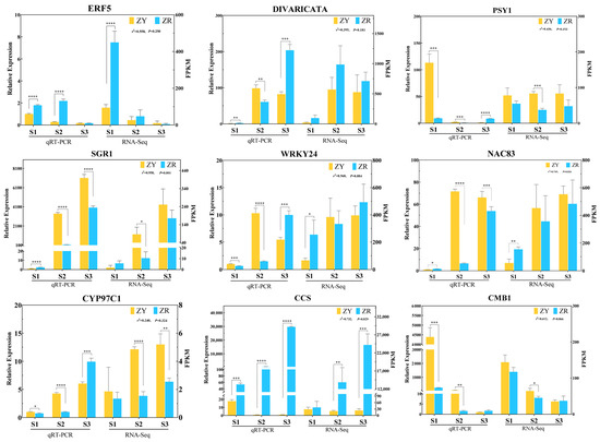 DEG analysis revealed that the number of differentially expressed structural genes in the carotenoid synthesis pathway was relatively low at the same stage between ZR and ZY. Therefore, we further analyzed transcription factor genes among the DEGs. The results showed that many transcription factors were significantly differentially expressed at different stages, including the transcription factor families of bHLH, MYB, ERF, WRKY, and NAC. At the S1 stage, the largest number of differentially expressed transcription factors was identified, including 20 ERF, 12 WRKY, 12 MYB, 9 bHLH, and 9 NAC genes (Table S4).
