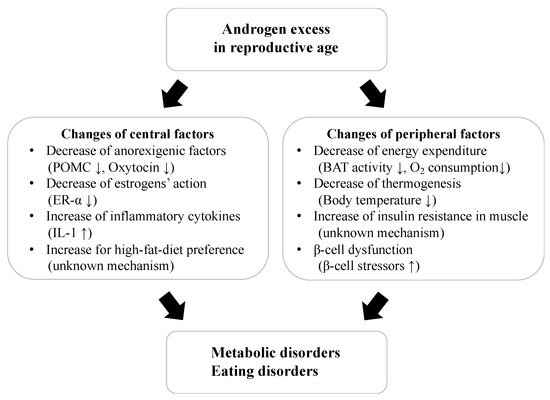 This review highlights the effects of androgens on metabolic and body weight regulation systems and their underlying mechanisms. Excess levels of endogenous and exogenous androgens in reproductive age can induce several unfavorable effects on metabolic functions and increase the risks of metabolic-related diseases. Basic studies using laboratory animals indicate that some central and peripheral factors and changes in physiological functions might be related to these adverse effects of androgens (Figure 1). Conversely, the effects of androgens on metabolic and body weight regulation systems in females of post-menopausal age are highly controversial.