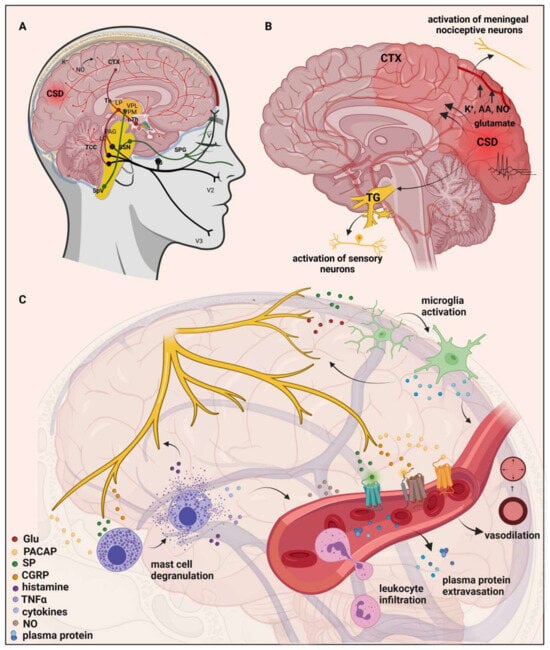 Some migraineurs experience an aura during migraine attacks, which is a manifestation of temporary visual and somatosensory disturbances caused by cortical spreading depression (CSD)—a slowly spreading wave of depolarization of neurons and glia in the cortex. The aura can encompass not only visual and sensory symptoms but also motor and brainstem symptoms, such as muscle weakness, speech problems, dizziness, or balance disturbances [,]. It has been suggested that high extracellular levels of glutamate and K+ may be responsible for the propagation of CSD []. CSD can activate sensory neurons in the trigeminal ganglia (TG), suggesting the central (CNS) and peripheral nervous system (PNS) have a role in migraine []. Following CSD, molecules such as ATP, glutamate, K+, H+, arachidonic acid (AA), and nitric oxide (NO) are released locally and are thought to diffuse to and activate meningeal nociceptive neurons [,,]; this leads to a localized rise in neuroactive inflammatory mediators and the sensitization of brainstem regions relevant to pain [,].