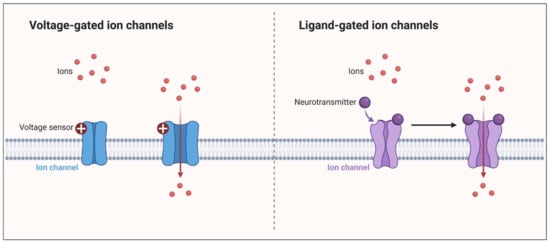 Ion channels are large membrane-spanning proteins that enable the selective transport of ions, such as potassium, calcium, and sodium. They mediate cell excitability and are essential for proper signaling and cell function []. Two types of ion channels can be distinguished, which open in response to changes in the membrane potential; these are voltage-gated ion channels (VGICs) and those that are opened by the binding of a ligand, such as a hormone or a neurotransmitter; these are ligand-dependent ion channels (LGICs) [].