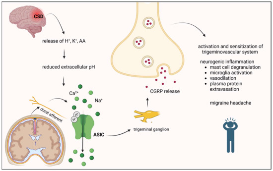 CSD results in a breakdown of cortical ion homeostasis and the release of H+, K+, and AA, which are known to potentiate ASICs. Blocking ASIC may inhibit CSD, and thereby aura formation, and prevent subsequent migraine headaches [].