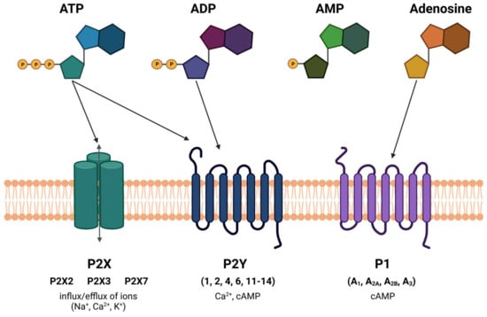 The purinergic system consists of purinergic receptors, which are divided into two main classes: P1 receptors (adenosine receptors) and P2 receptors (adenosine 5′-triphosphate (ATP) receptors). P1 adenosine receptors are further classified into A1, A2A, A2B, and A3 subtypes. Adenosine, a breakdown product of ATP, binds to these receptors and can have inhibitory or excitatory effects on neurotransmission, inflammation, blood vessel diameter, or pain perception [,,,]. For instance, adenosine’s binding to A1 receptors can inhibit neurotransmitter release [], while its binding to A2A receptors can have vasodilatory effects []. P2 receptors are divided into two main types: P2X receptors (ligand-gated ion channels) and P2Y receptors (G-protein-coupled receptors). ATP, released from various cell types, can activate these receptors, leading to various cellular responses. P2X receptors are responsible for the inflow of cations into the intracellular space of the cell, and they can be found in all mammals. These receptors consist of the heteromeric P2 × 2/3 and P2 × 1/5 receptors, and the homomeric P2 × 1, P2 × 2, P2 × 3, P2 × 4, P2 × 5, P2 × 7 channels.