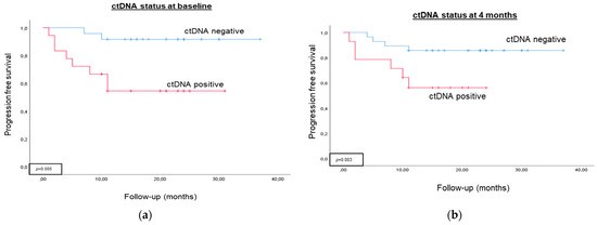 Cox regression analysis evaluated ctDNA status at each follow-up time point and clinicopathological variable. Univariate Cox regression analysis identified positive ctDNA status as a prognostic biomarker of tumor progression before RC and 4 and 12 months later (HR 6.774, HR 3.673, and HR 30.865, respectively; p < 0.05). Figure 1 depicts Kaplan–Meier curves showing that ctDNA status can discriminate between two groups of MIBC patients with a significantly different probability of tumor progression before RC and during patient follow-up. Contrarily, ctDNA status was not found to be a prognostic biomarker of CSS at any follow-up time point.