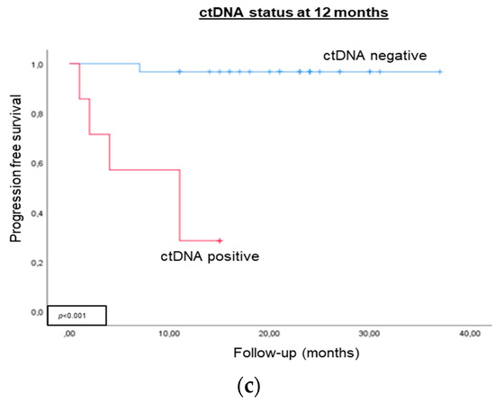 Prognostic value of ctDNA status at different time points. The Kaplan–Meier survival analysis shows the probability of tumor progression in MIBC patients stratified by ctDNA status (a) at baseline, (b) four months after RC, and (c) 12 months after RC.