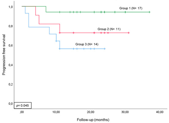 The patients were stratified into three groups according to their ctDNA status before RC and four months later: Group (1) patients with negative ctDNA status at baseline and at four months; Group (2) patients with positive ctDNA status at baseline and negative ctDNA status four months after RC (ctDNA clearance); and Group (3) patients with positive ctDNA status at four months. As shown in Figure 2, dynamic changes in ctDNA status were significantly associated with the patients’ clinical outcomes. In brief, those patients with a positive ctDNA status four months after RC (Group 3) had the poorest clinical outcome. On the other hand, those patients with ctDNA clearance after RC (Group 2) had significantly longer progression-free survival (PFS) than those from Group 3. Finally, patients with undetectable ctDNA in their bloodstream (Group 1) had the best clinical outcome.