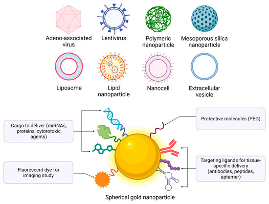 There are different types of delivery systems: virus vectors, polymeric-based, lipid-based, inorganic-based, and extracellular vesicle-based vectors. Gold nanoparticle functionalization with various ligands, molecules, and cargo. This figure was created with BioRender.com (accessed on 21 September 2023) with the agreement number MU25VPRPQK.