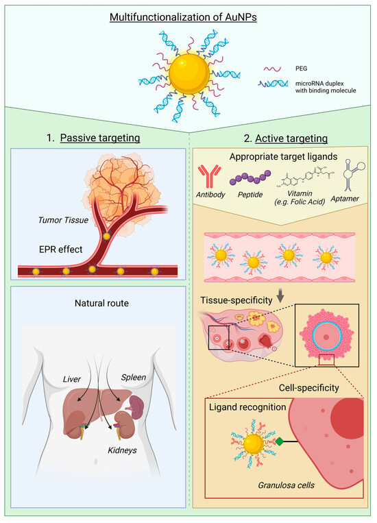 Gold nanoparticles are conjugated to specific target ligands, microRNAs, and PEG. There are two types of targeting phenomena: (1) Passive targeting of AuNPs exploiting the EPR effect of the tumor or natural route after administration; (2) Active targeting of AuNPs requiring functionalization with target ligands such as antibodies, peptides, vitamins (e.g., folic acid), or aptamers (DNA, RNA, or peptide molecules that bind to a specific target molecule). Once the appropriate target ligand is selected, AuNPs can reach specific cells by utilizing receptor-ligand recognition. AuNP: Gold nanoparticle; EPR: Enhanced permeability and retention; PEG: Polyethylene glycol. This figure was created with BioRender.com (accessed on 21 September 2023) with the agreement number WN25VPRLH5.
