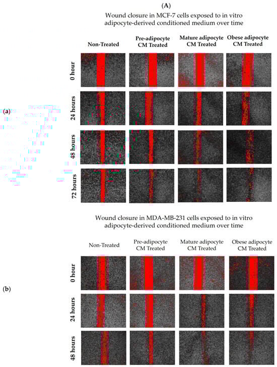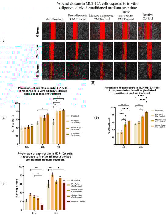 To investigate the effect of adipocyte-secreted factors on the migratory potential of breast cells, a wound healing assay using a novel Wound Assay Device [] was performed. Images at time 0 represent the area of the wound at the time of scratch formation. Images in Figure 1 show the cells that migrated to the wound area at time 24, 48, and 72 h. Breast cancer cells MDA-MB-231 and MCF7 took ~72 h and 96 h, respectively, to close the wound completely for many of the treatment conditions. Interestingly, non-tumorigenic breast cells MCF-10A were faster in closing the wound with exposure to the adipocyte-derived conditioned medium in comparison to MCF7. MCF-10A cells also took ~72 h to close the wound completely for many of the treatment conditions. Both MCF7 (Figure 1(Aa,Ba)) and MDA-MB-231 (Figure 1(Ab,Bb)) cell lines, exposed to in vitro mature and obese adipocyte-derived conditioned media, were faster in closing the wound than the untreated cells. Highly metastatic MDA-MB-231 breast cancer cells showed enhanced migratory capabilities in closing ~80% of the wound in 48 h when cultured with obese adipocyte-derived conditioned medium than the low metastatic MCF7 breast cancer cell after 72 h. For MCF7 cells, culture with pre- and mature adipocyte-derived conditioned media was also very successful in promoting wound closure to 80% in 72 h versus untreated MCF7 cells. Interestingly for the non-tumorigenic MCF-10A cells, preadipocyte-derived conditioned medium was the most effective in closing 80% of the wound in 48 h (Figure 1(Ac,Bc)) versus the other treatments (mature- and obese-derived adipocyte conditioned media). Moreover, exposure to pre-adipocyte-derived conditioned medium promoted MCF-10A cells to close the wound faster than the MCF-10A cell exposed to their standard culture medium supplemented with 10% FBS (Positive Control) as mentioned in the Methods.