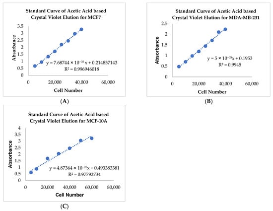 The breast cancer cell lines MCF7 and MDA-MB-231 were cultured in high glucose Dulbecco’s Modified Eagle Medium (DMEM; Gibco, Catalogue# 12800-017, Waltham, MA, USA) supplemented with 10% Fetal Bovine Serum (FBS; ATLAS Biologicals, Catalogue# F-0500-D, Fort Collins, CO, USA) and 1% Penicillin and Streptomycin (Thermo Fisher Scientific, Catalogue # 15140-122; Waltham, MA, USA) in a humidified atmosphere of 5% CO2 at 37 °C. The nontumorigenic cell line MCF-10A was cultured in DMEM/Ham’s F-12 (Invitrogen, Catalogue # 11330-032; Carlsbad, CA, USA) supplemented with 5% horse serum (Invitrogen, Catalogue# 16050-122; Carlsbad, CA, USA), 20 ng/mL recombinant human epidermal growth factor (EGF; Catalogue# PHG0311Gibco, Waltham, MA, USA), 0.5 µg/mL hydrocortisone (Sigma-Aldrich, Saint Louis, MO, USA), 100 ng/mL cholera toxin (Sigma-Aldrich, Catalogue# C8052, Saint Louis, MO, USA), 10 mg/mL insulin (Sigma-Aldrich; Catalog # I0516, Saint Louis, MO, USA), and 1% Penicillin/Streptomycin (Gibco, Catalogue # 15140-122, Waltham, MA, USA) in a humidified atmosphere of 5% CO2 at 37 °C.